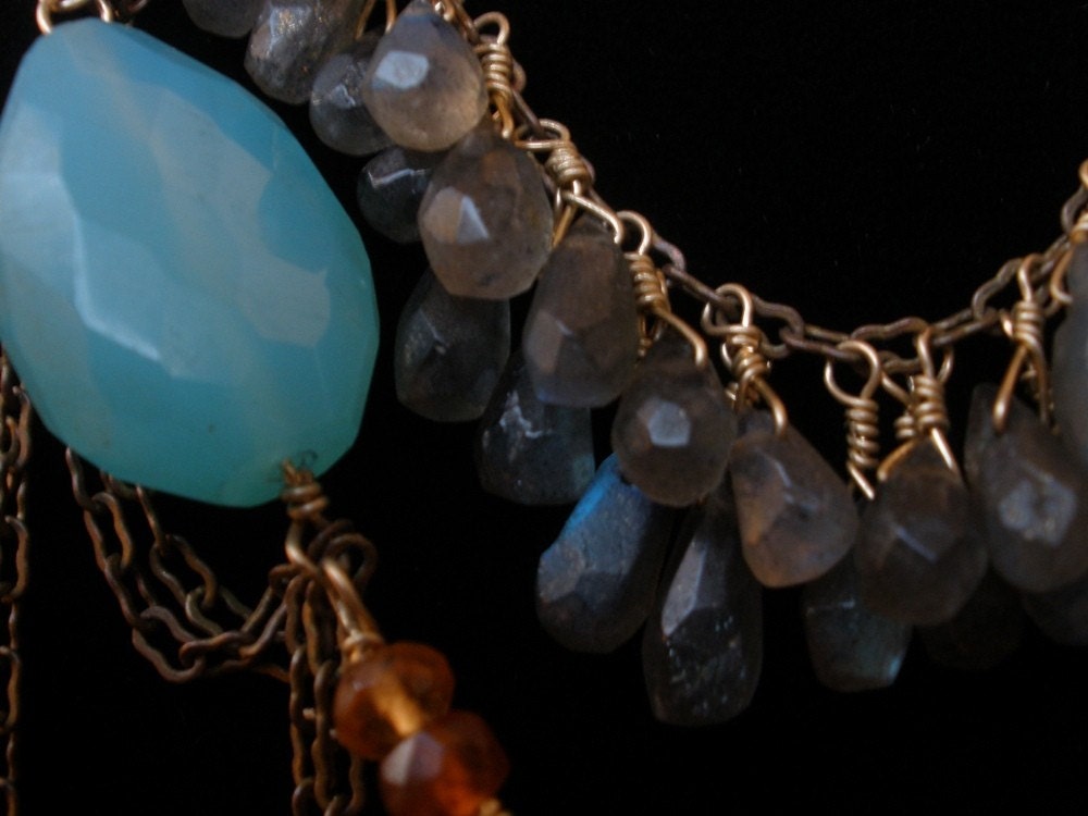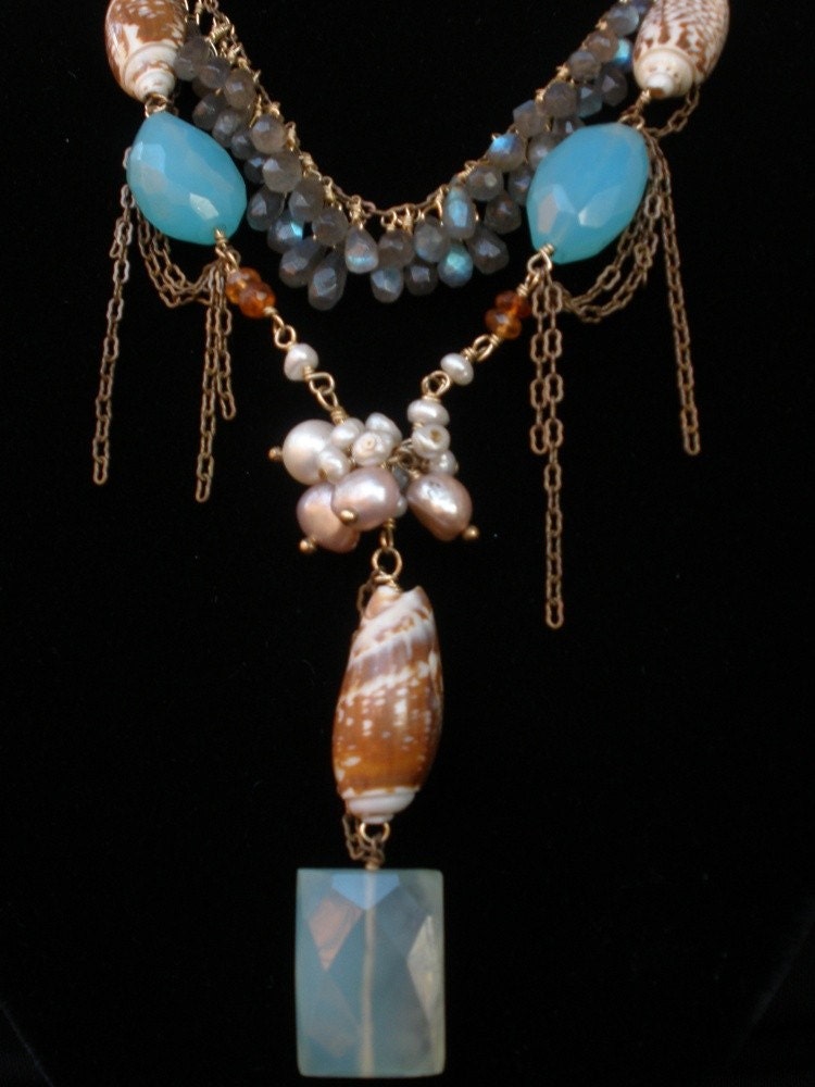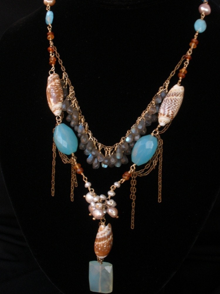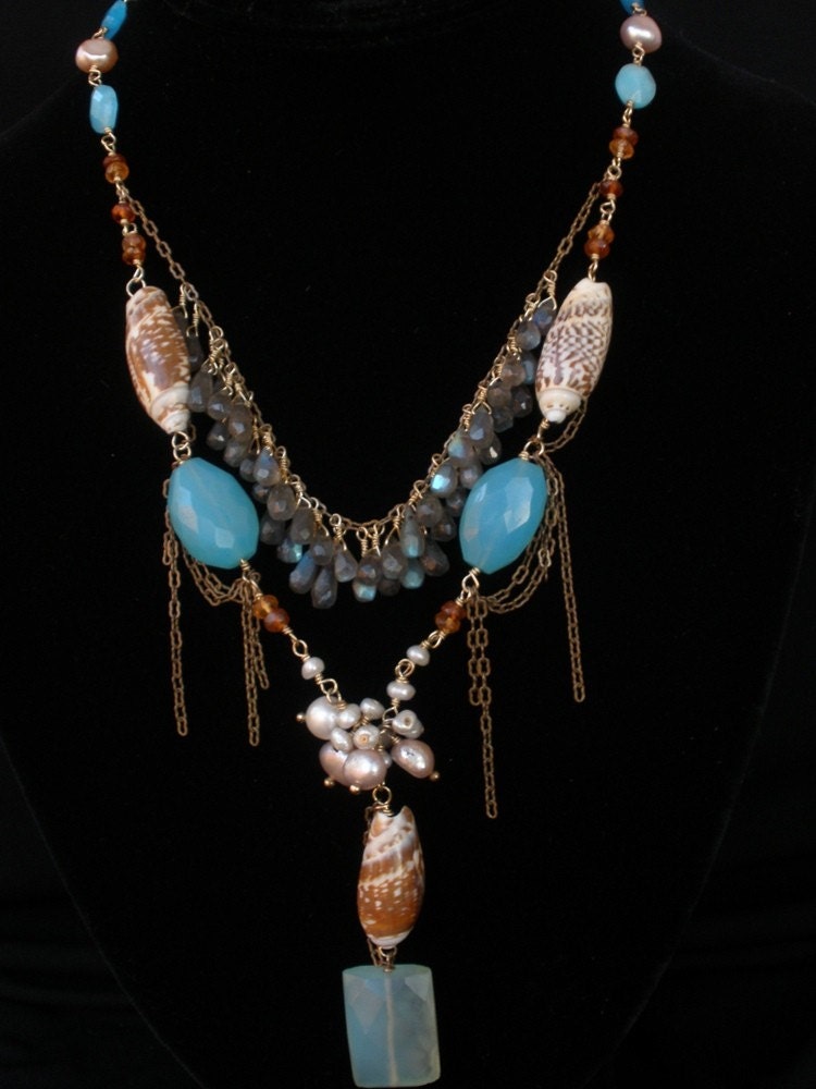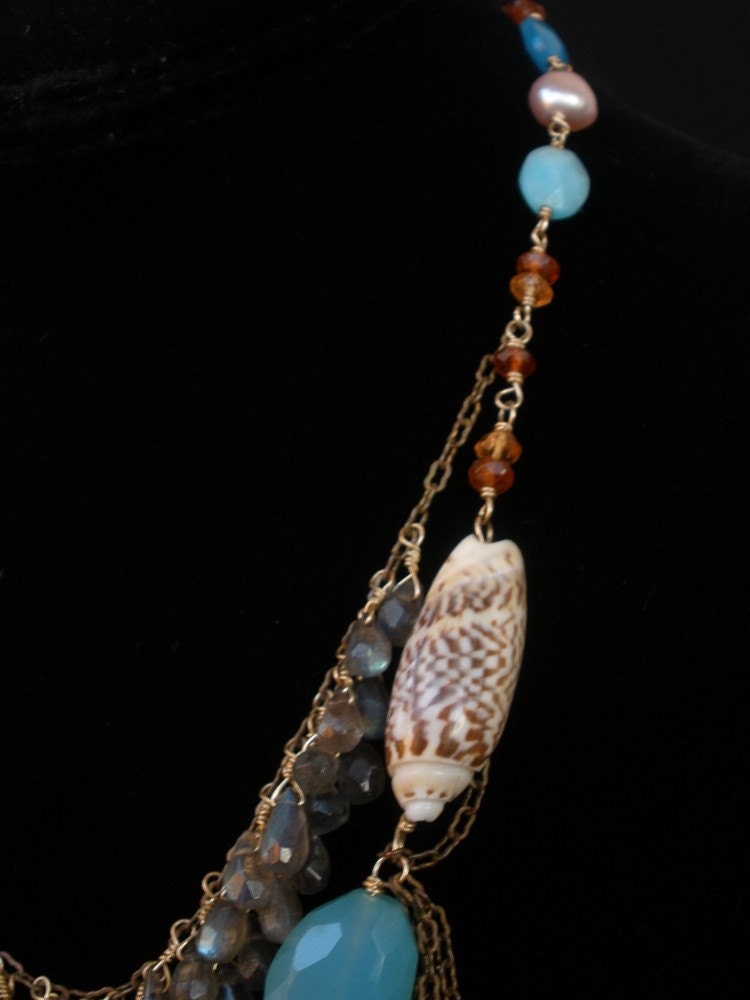 This piece is a shimmer of silverey grays and electric notes of blue, dripping with antique looking chains, coppery green, like swaying seagrass... A cluster of pearls rise to the surface and the edges are accented by tawny, Hessonite Garnets... The pendant and large blue ovals are faceted Chalcedony and are set off by delicately speckled, brown and white shells... Faceted Blue Quartz lie at the sides... The second strand of decorative Brass chain is woven with rich clusters of faceted Labradorite teardrops in exquisite silvery gray that catch the light with flashes of electric blue.... The necklace is finished with an initialed 14KT gold fill tag and Toggle clasp.... Chains are brass and all findings are 14KT gold fill.