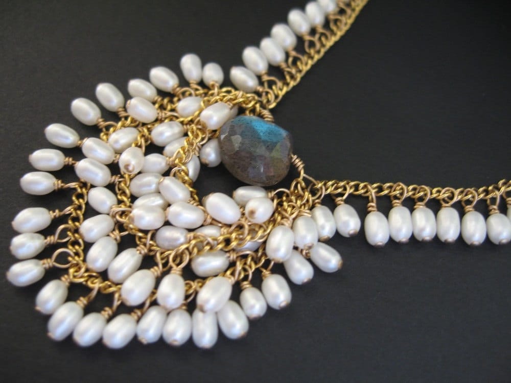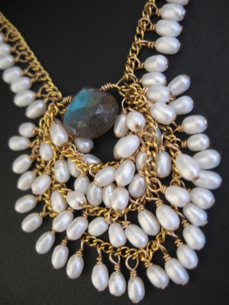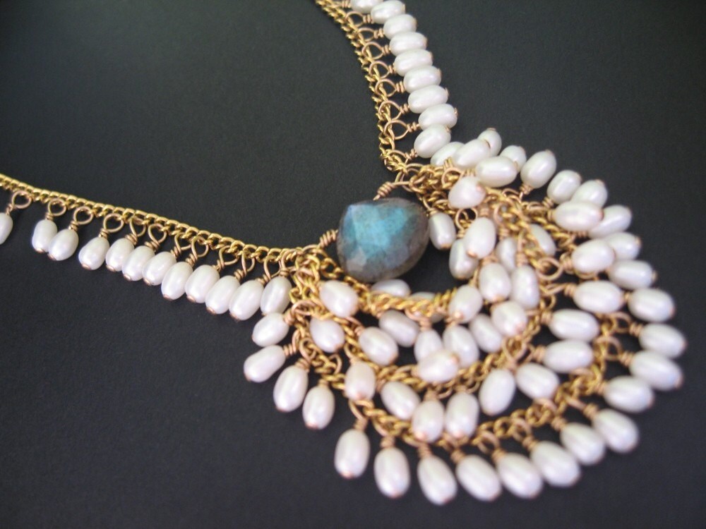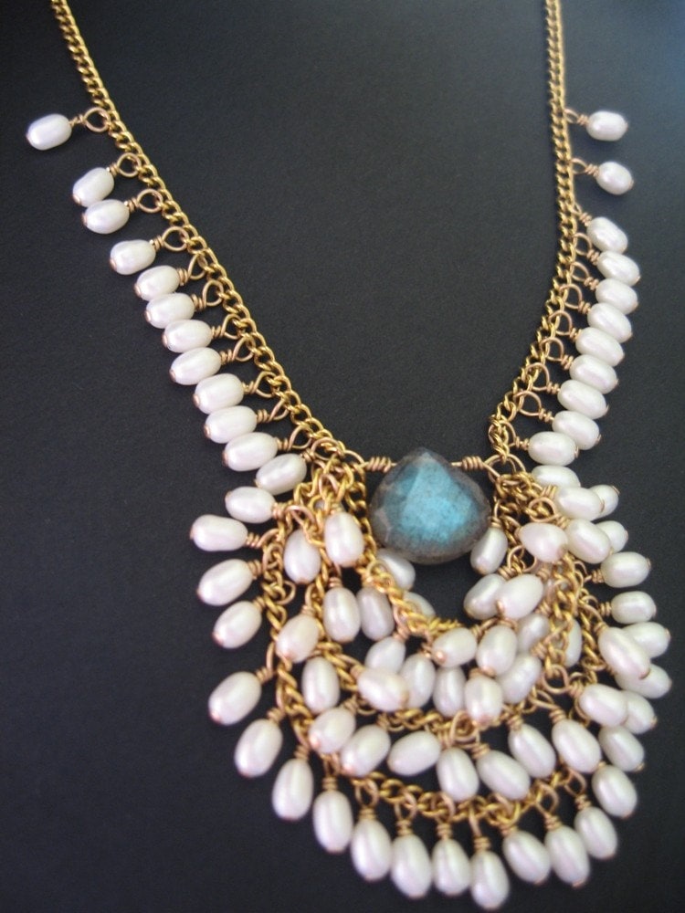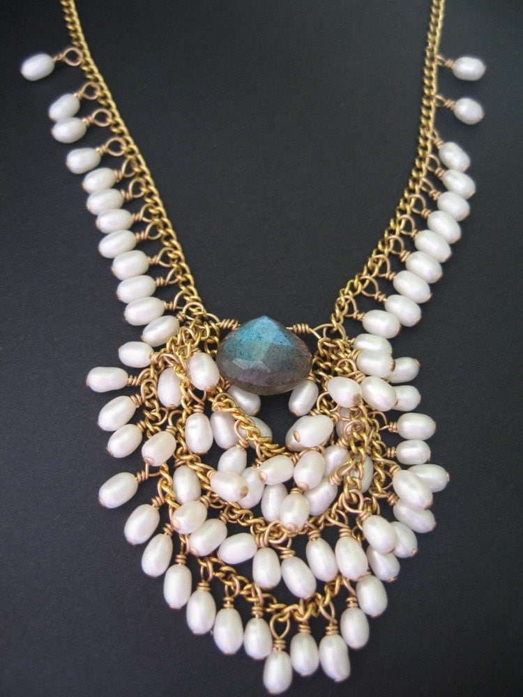 This is delicate, yet eye-catching necklace... Dainty white seed pearls, create a wing-like effect, feathered along draping 14kt gold fill curb chains and framing a solitary, faceted Labradorite teardrop that flashes with electric blue and smokey gray.... All findings, chains, clasp and hand initialed tag, used in this necklace are 14kt gold fill.
