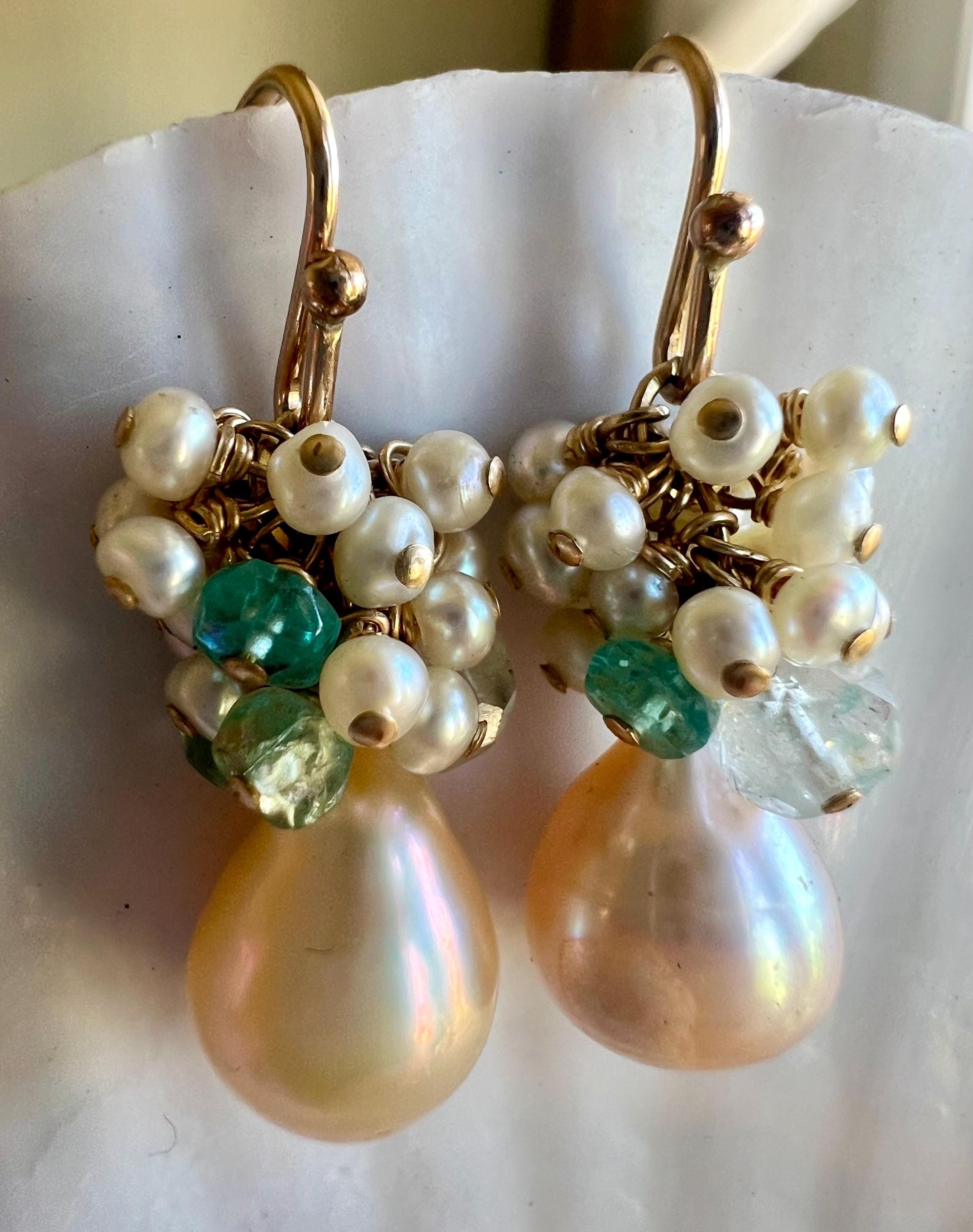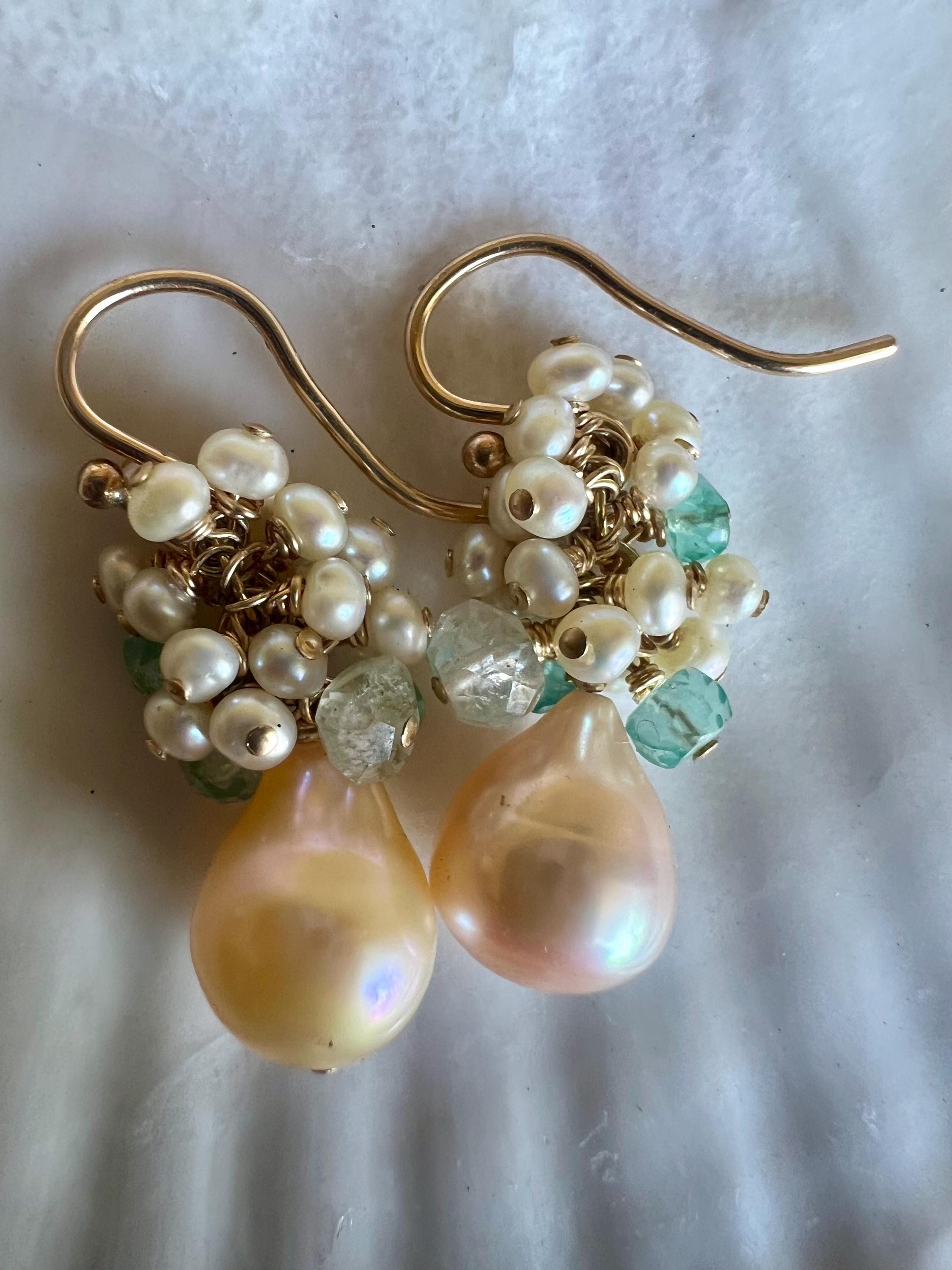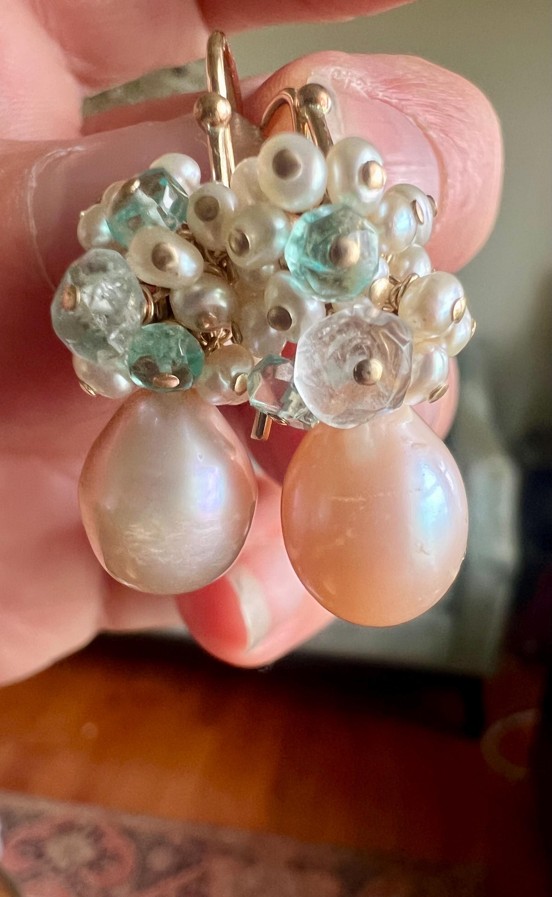 These dainty drop earrings are perfect for any occasion.. The delicate peachy pinks, aquamarine and luster of the pearls against gold, bring to mind the delicate pastels, used for the frescos I saw in Italy…