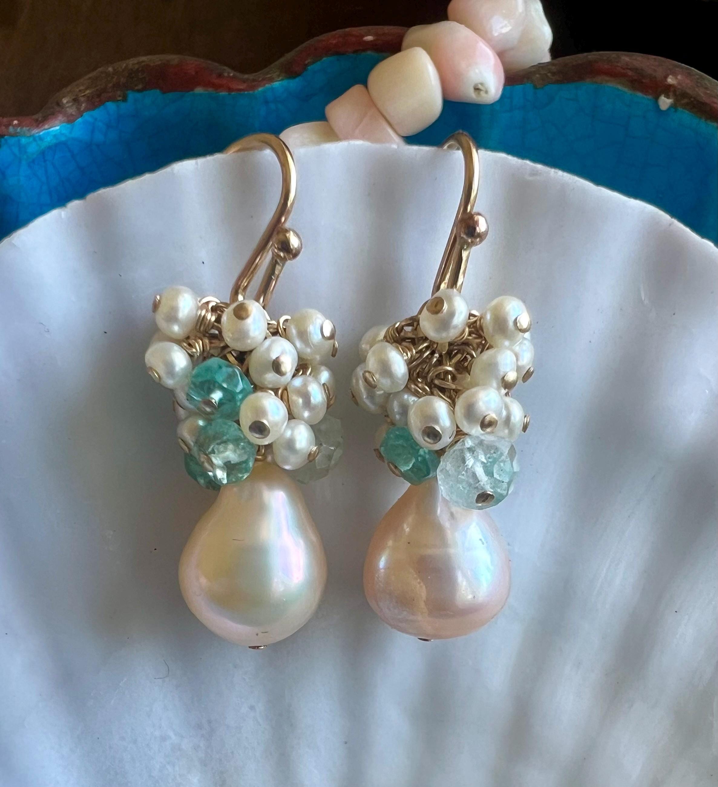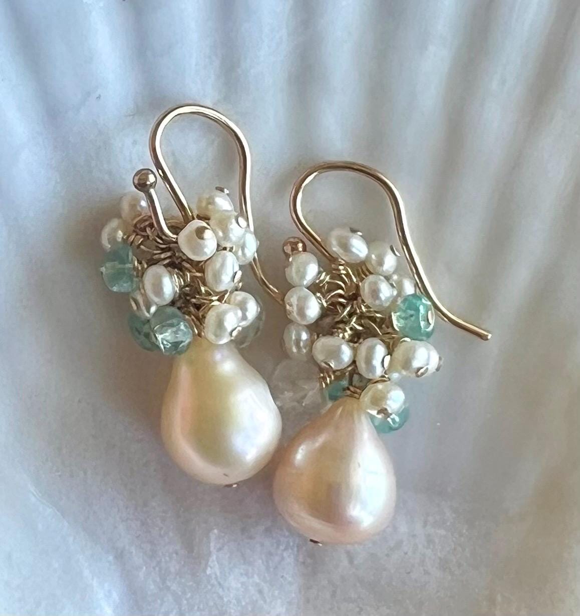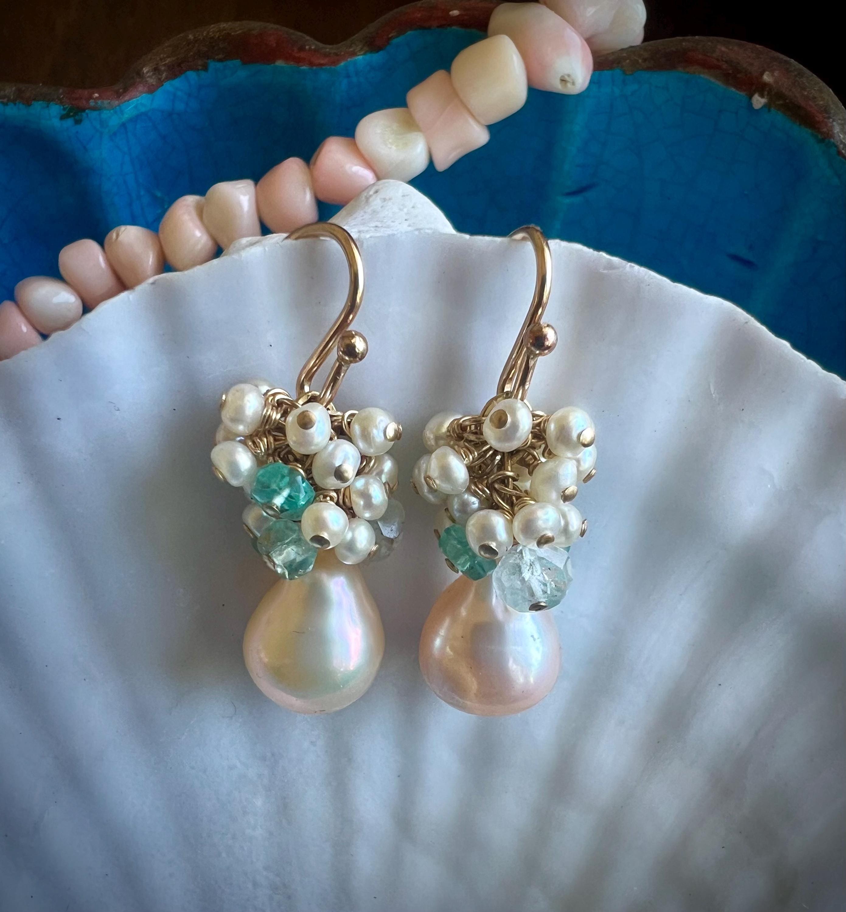 Here we have natural baroque pearls, with a delicate peach and pink luster, draped with clusters of tiny, white freshwater pearls and brought together by a flash of aqua blue faceted Apatite and two Topaz Rondelles…