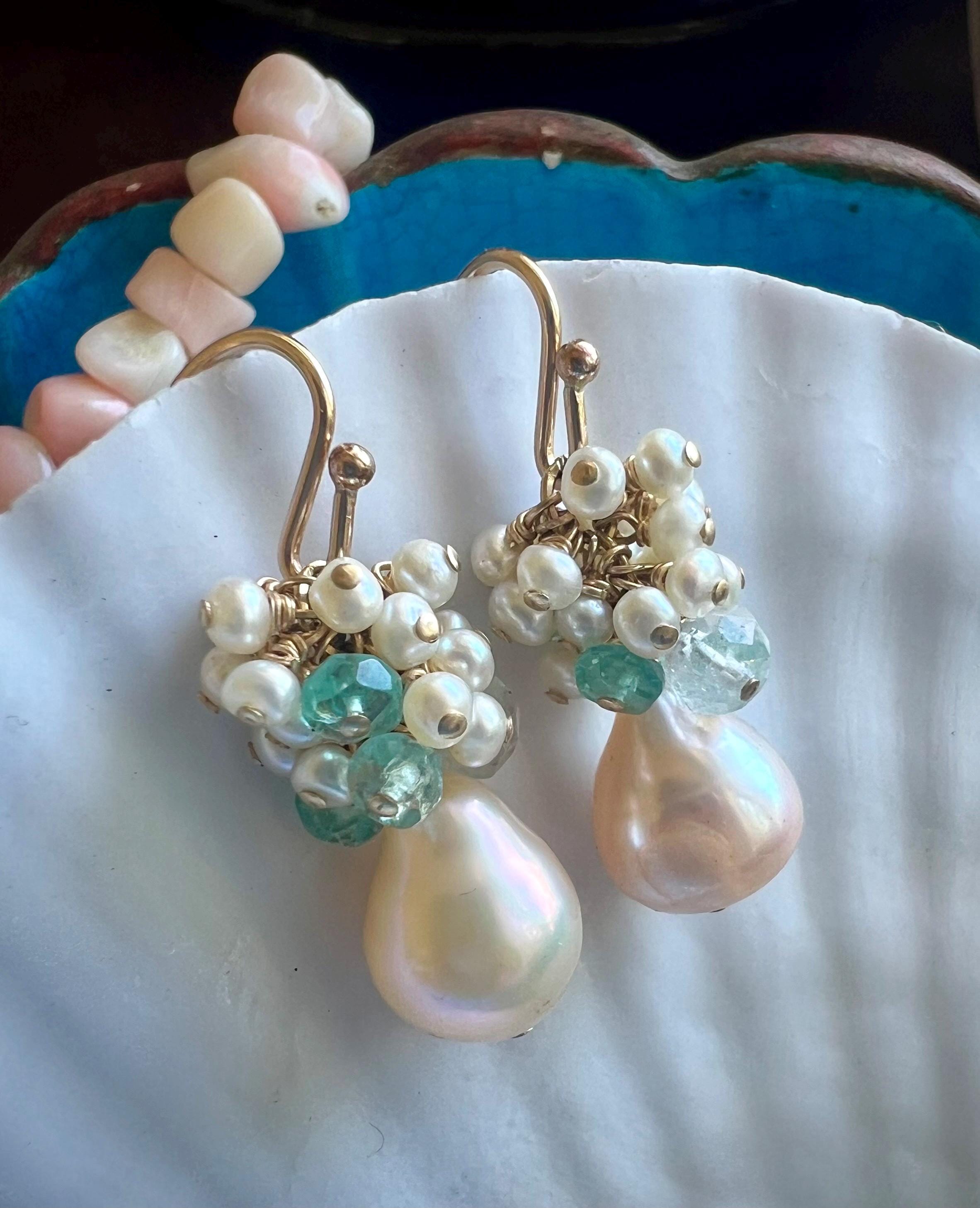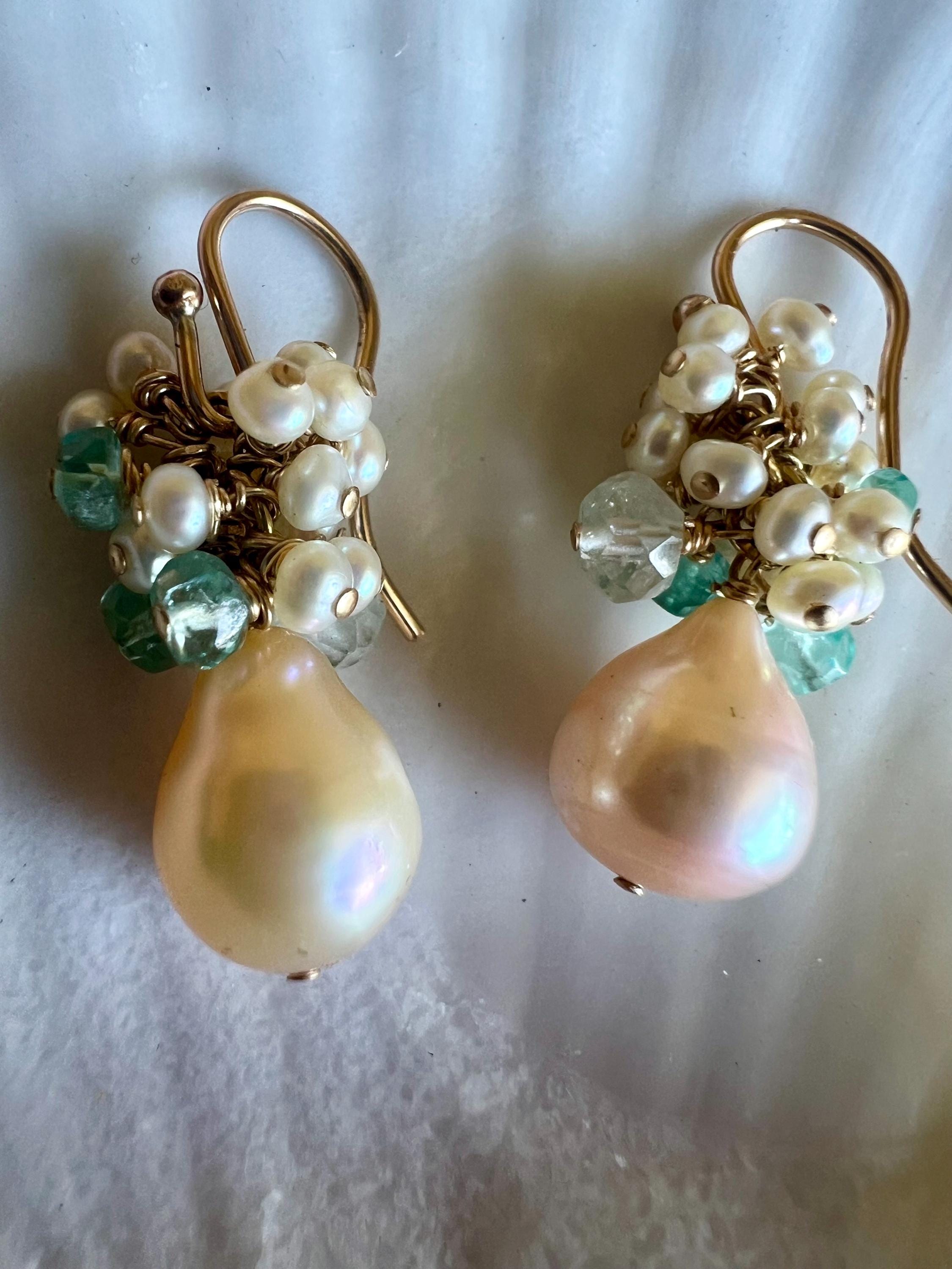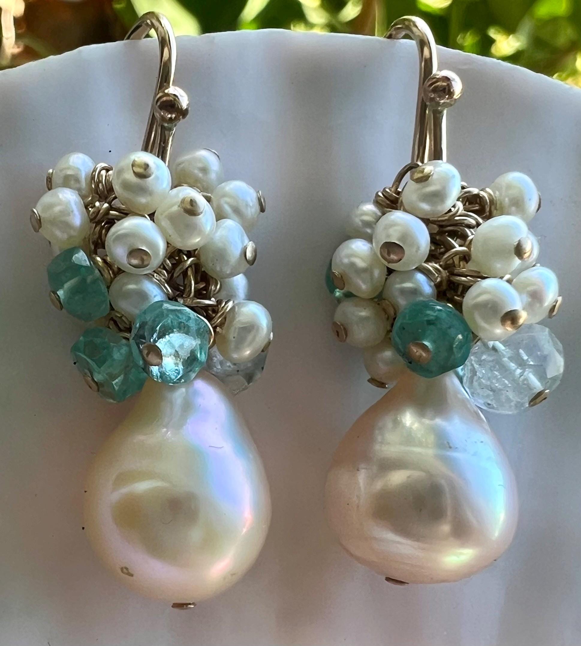 Here we have natural baroque pearls, with a delicate peach and pink luster, draped with clusters of tiny, white freshwater pearls and brought together by a flash of aqua blue faceted Apatite and two Topaz Rondelles…
