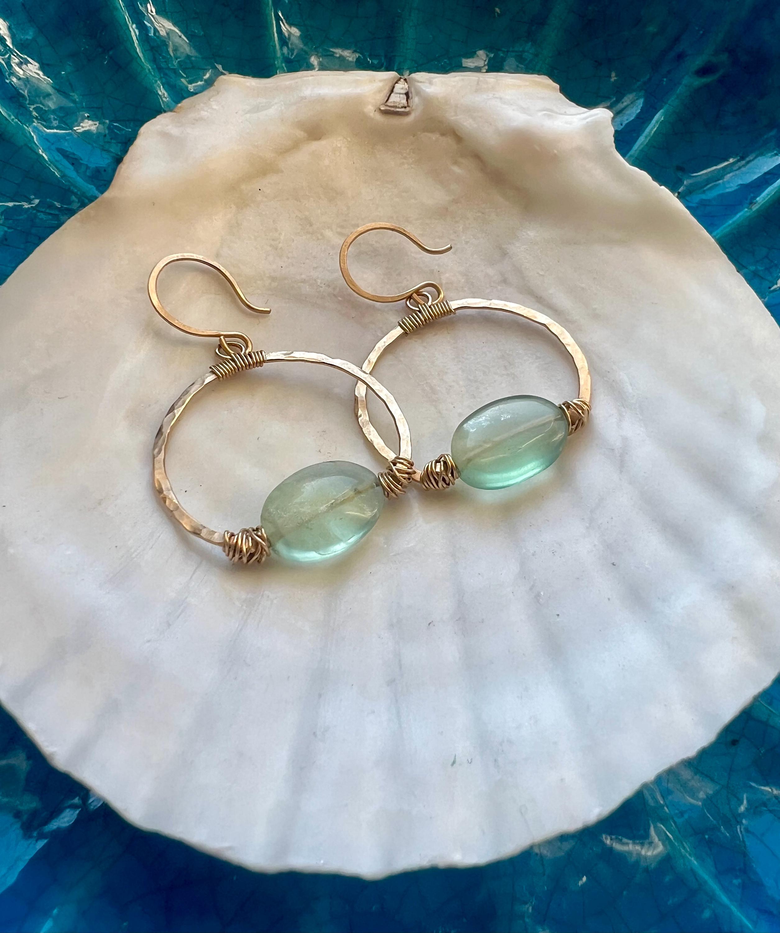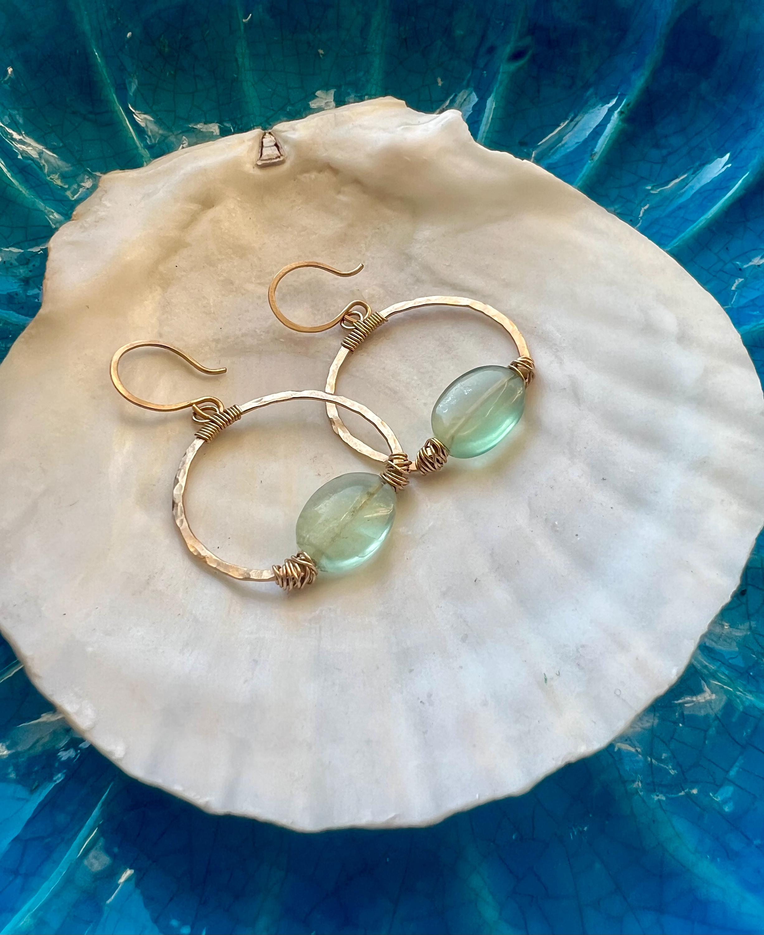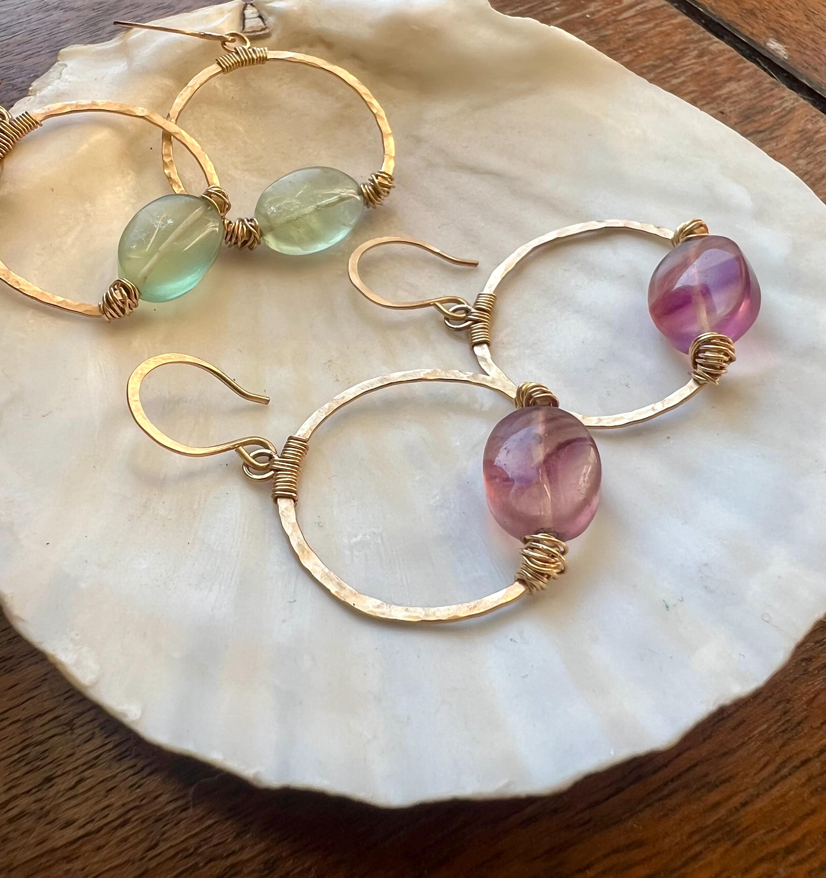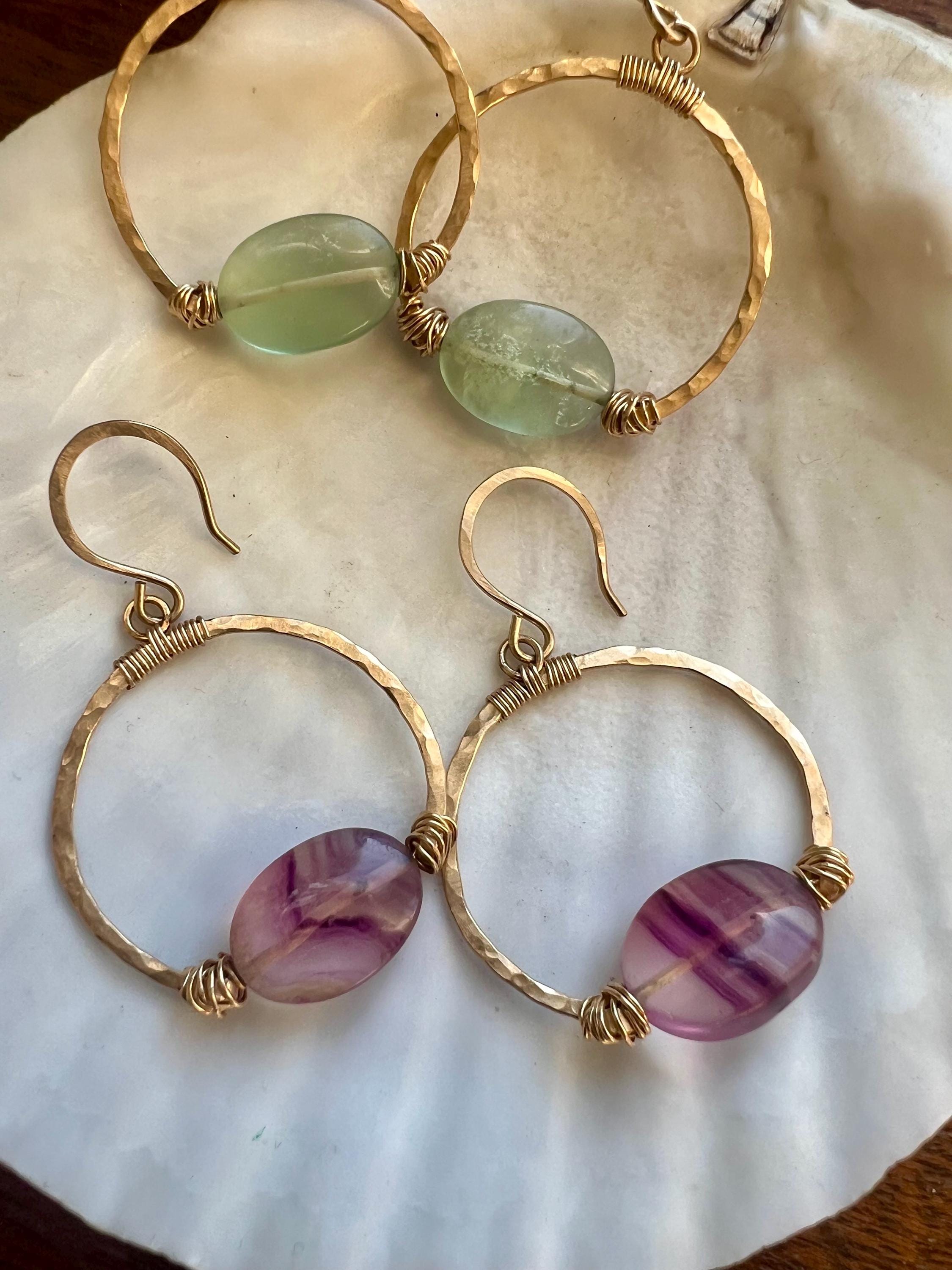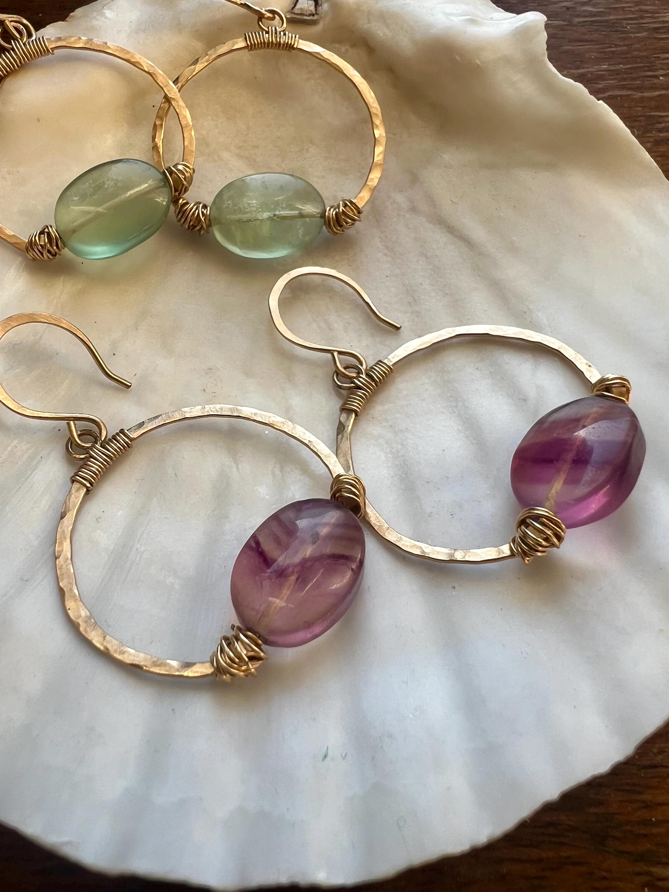 The delicate 14 kt gold filled frames are textured to give that extra shine and nestled in the bottom, are the glowing Fluorite gem stones.. I have a pair in green and another in violet.. These stones have a beautiful way of catching the light and framing the face..