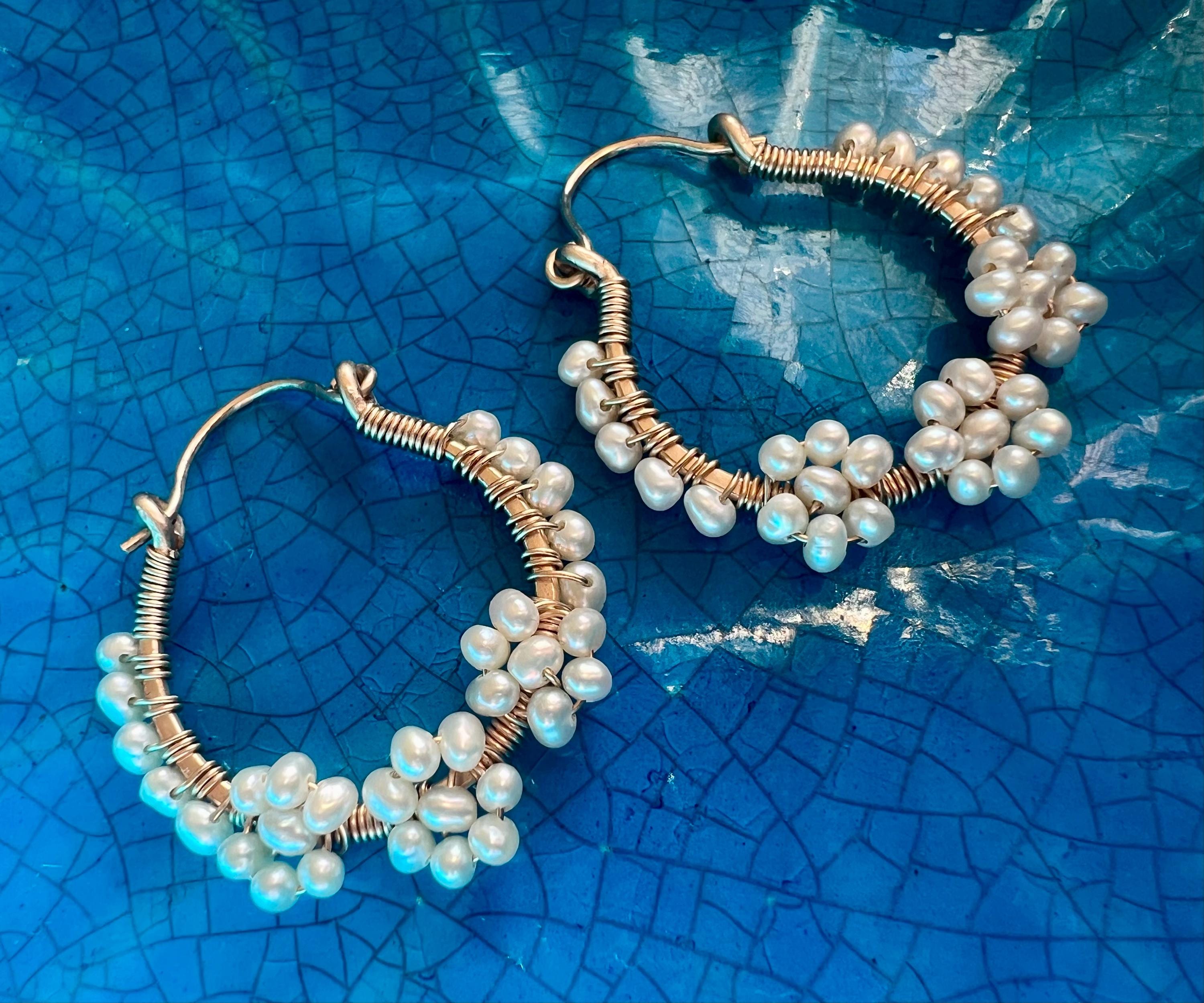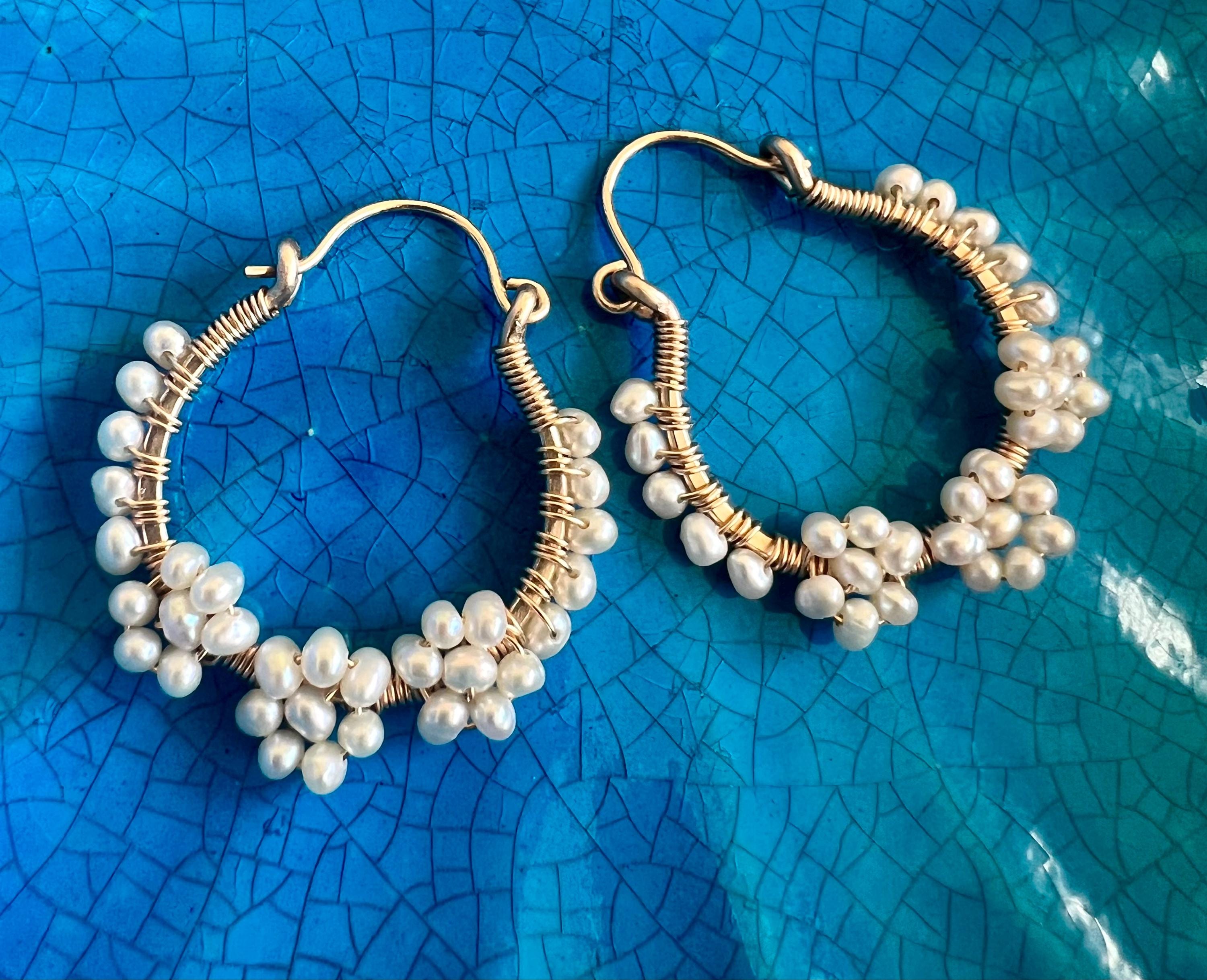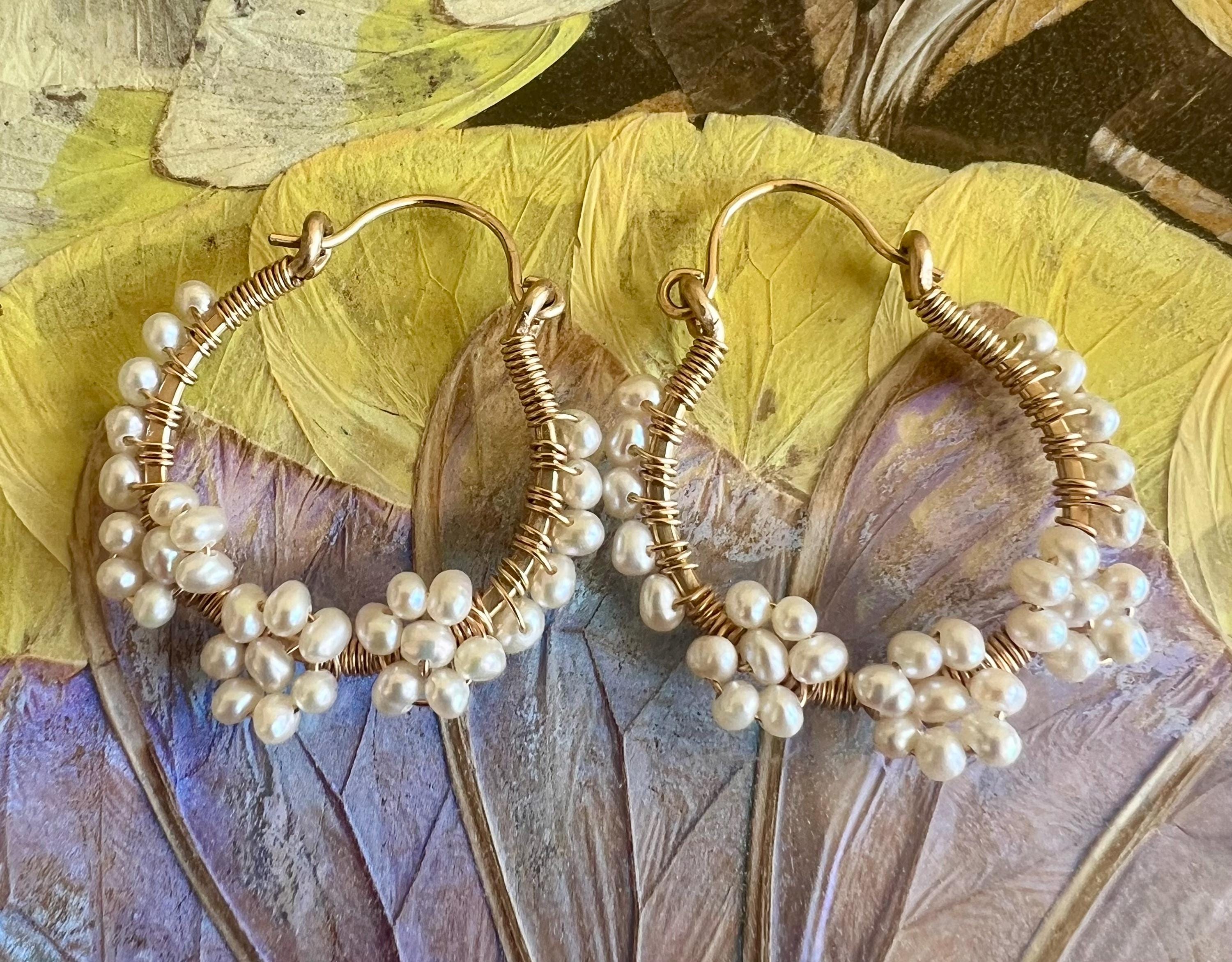 The frames and earring hooks are hand crafted and forged by me… I have wrapped them with tiny, white freshwater pearls, in a floral pattern, that reminds me of the blossoms, I’m seeing scattered across the sky’s lately… a welcome breath of springtime in the air..