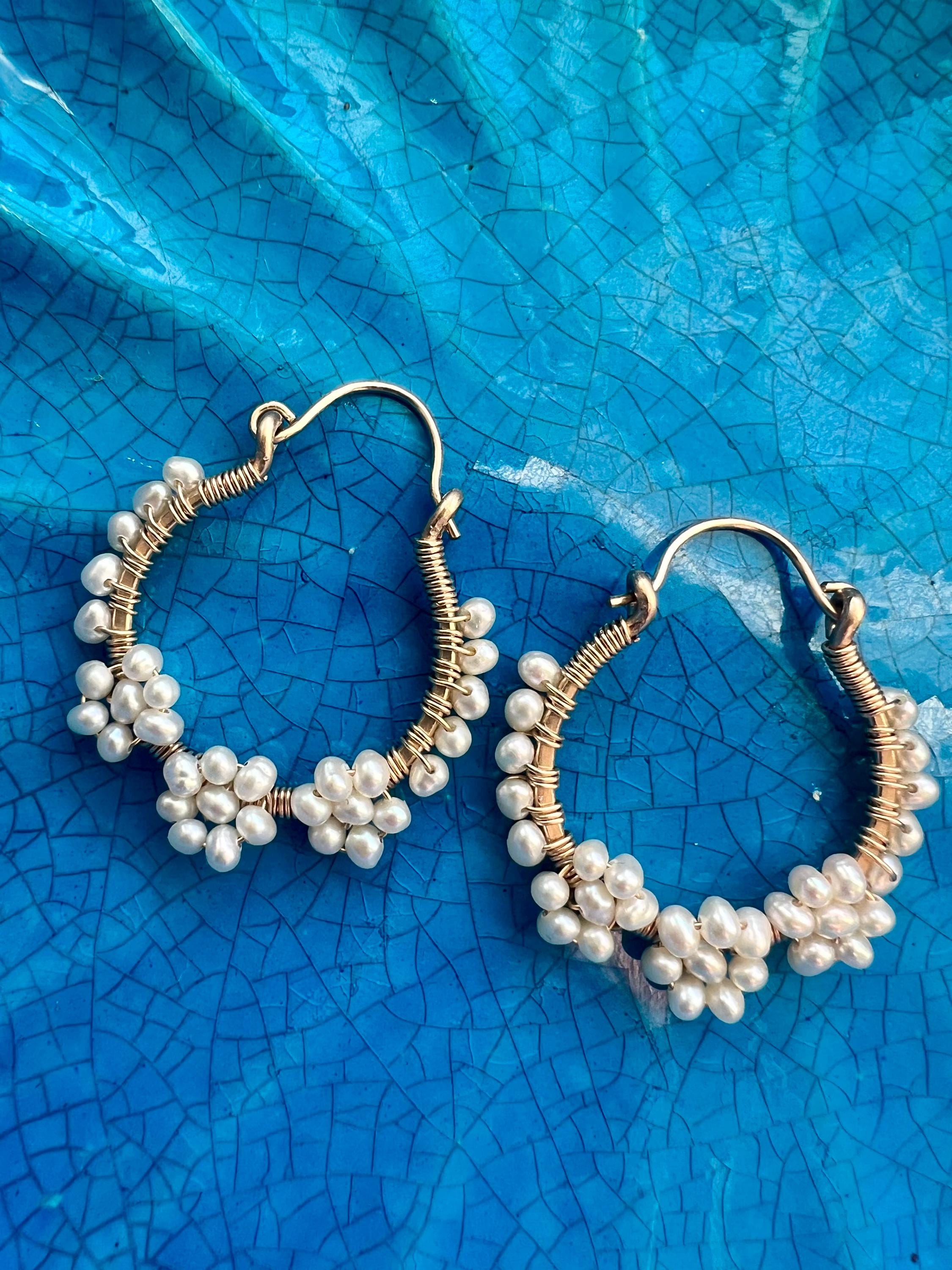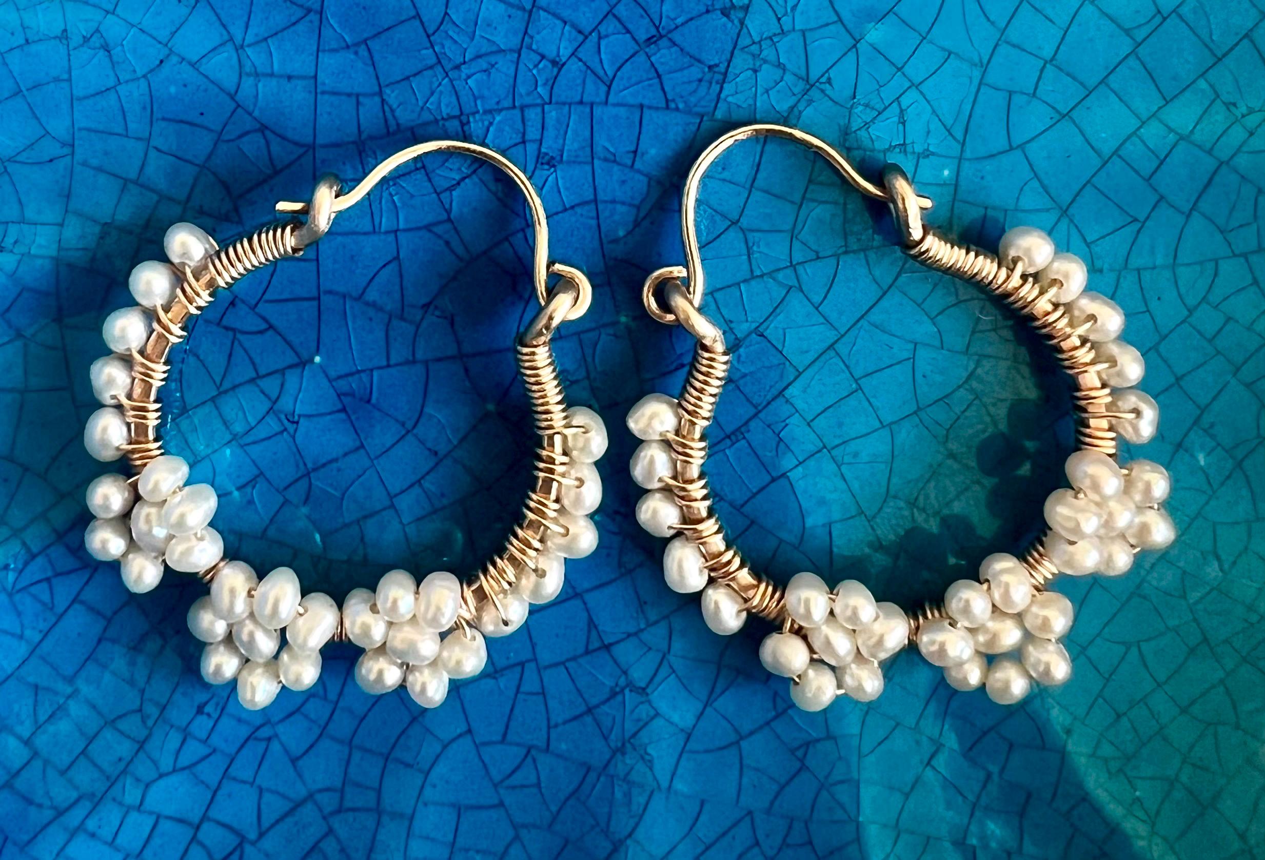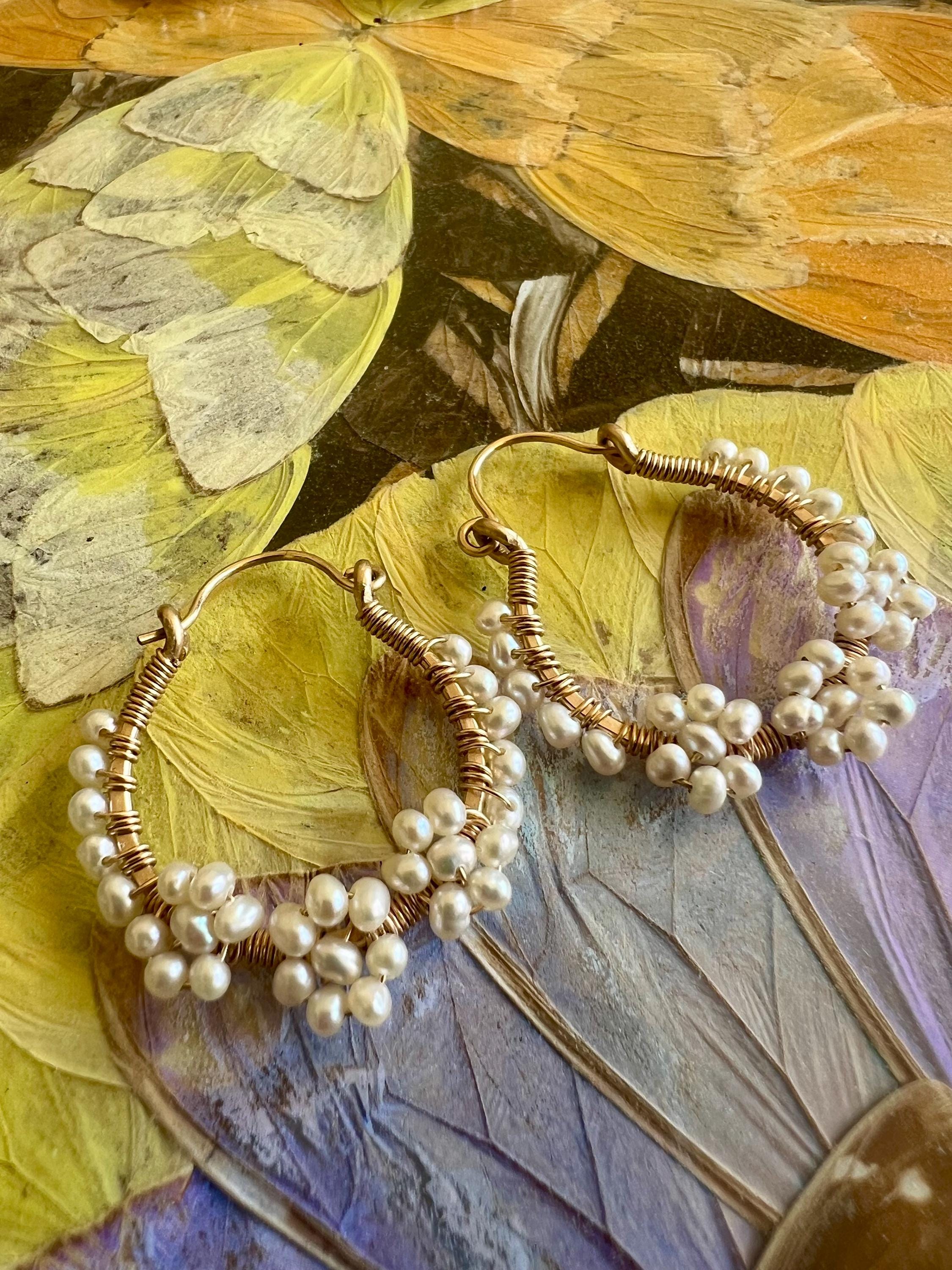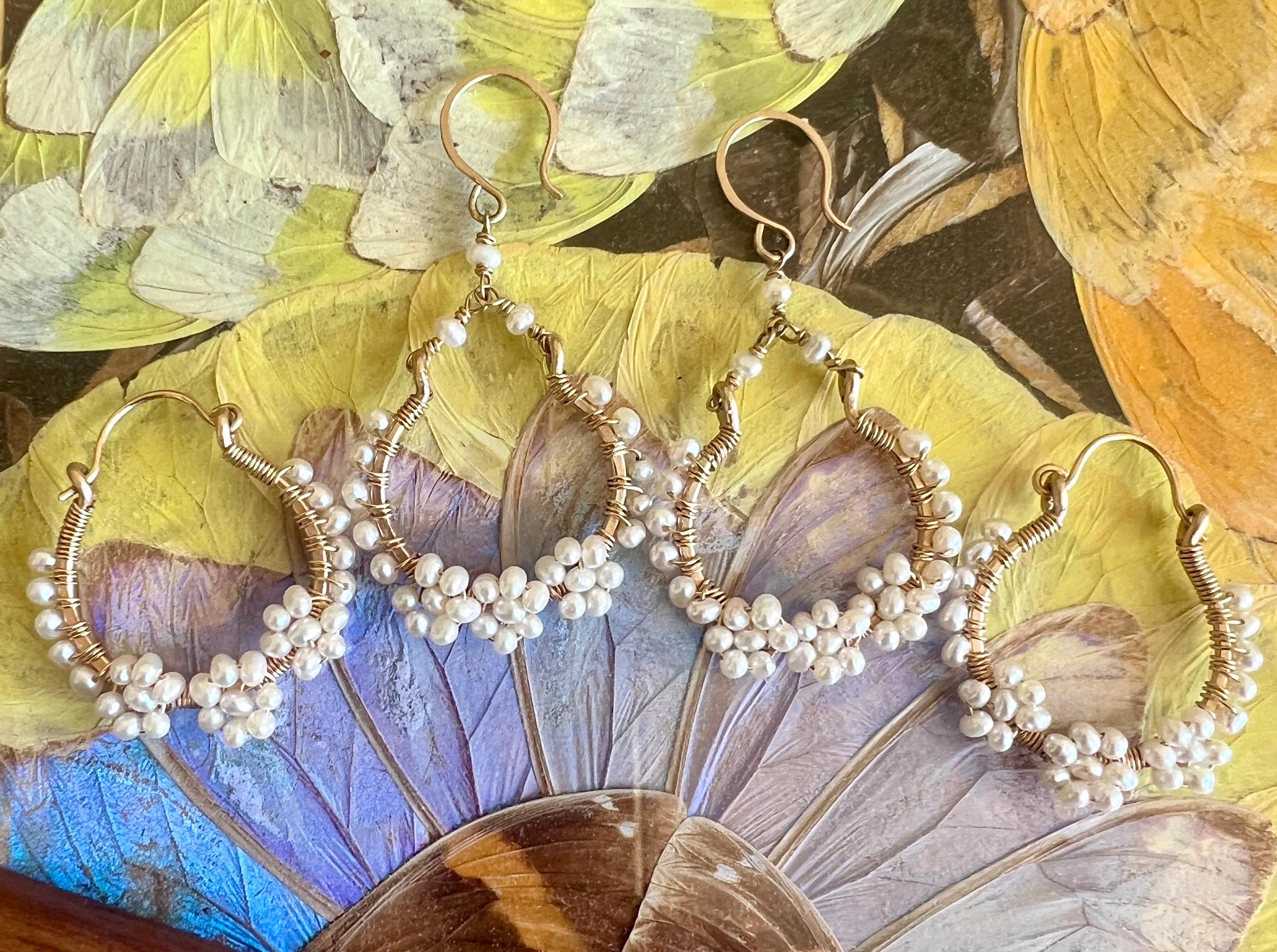 The frames and earring hooks are hand crafted and forged by me… I have wrapped them with tiny, white freshwater pearls, in a floral pattern, that reminds me of the blossoms, I’m seeing scattered across the sky’s lately… a welcome breath of springtime in the air..
